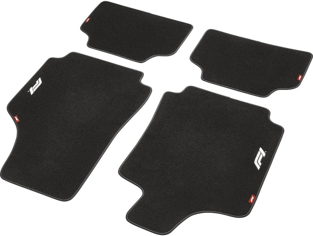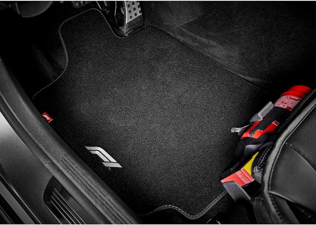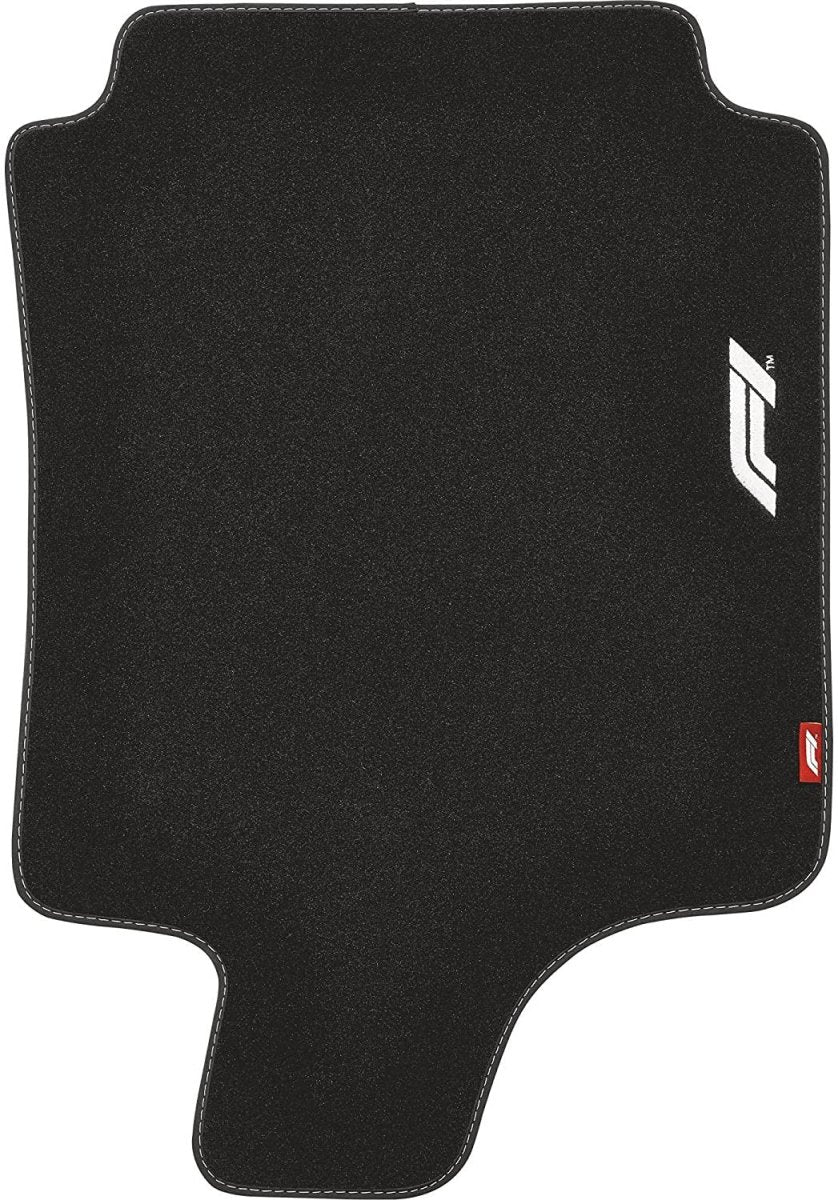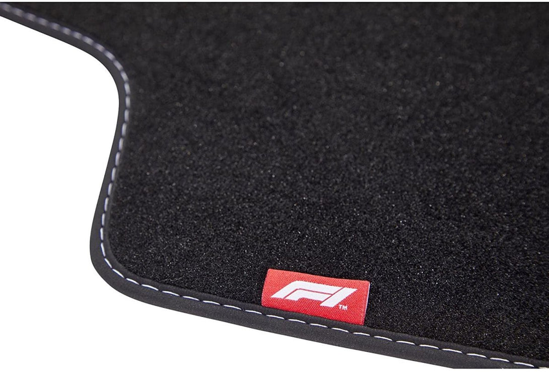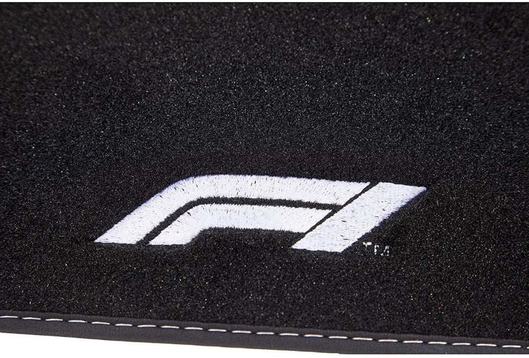 Tapetes têxteis três vezes mais espessos do que o normal com o logótipo branco da Fórmula 1 e costuras decorativas brancas