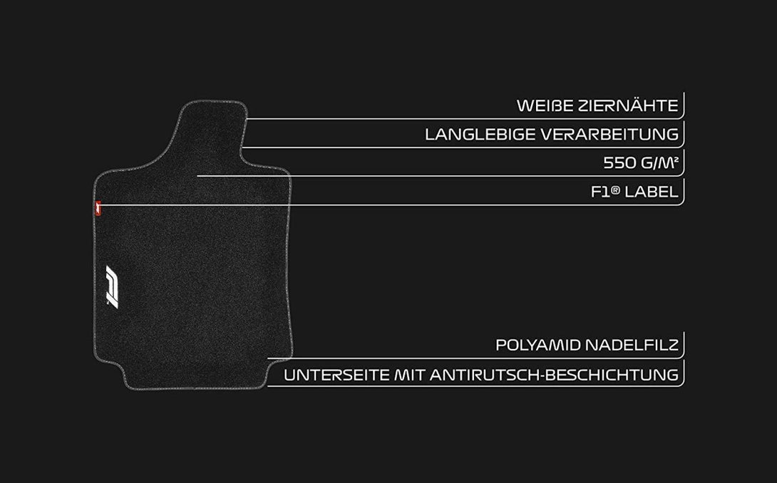 Tapetes Carro Universal Formula1 Preto Branco com 4 peças para os pés do condutor, do passageiro e da retaguarda com um design premium, fabricadas em feltro de agulha de poliamida de 550 g/m².